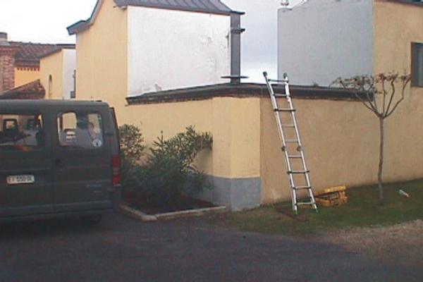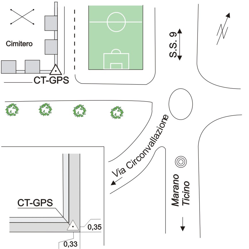 Centrino di tipo "GPS C" fissato in asse al pilastro all'angolo est del muro di recinzione del cimitero di Marano Ticino.