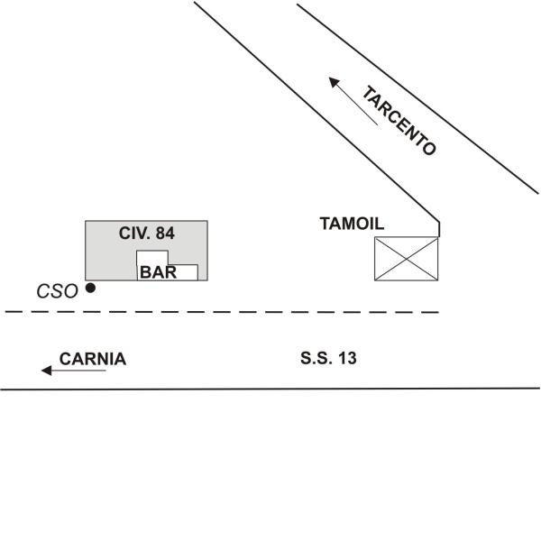 | Contrassegni | [{"simbolo_contrassegno":"B1","materializzazione":"(CSO) – Nella facciata parallela alla S.S. 13, alllo spigolo di sinistra del bar presso il rifornimento TAMOIL, dopo il bivio per Tarcento ."}] |