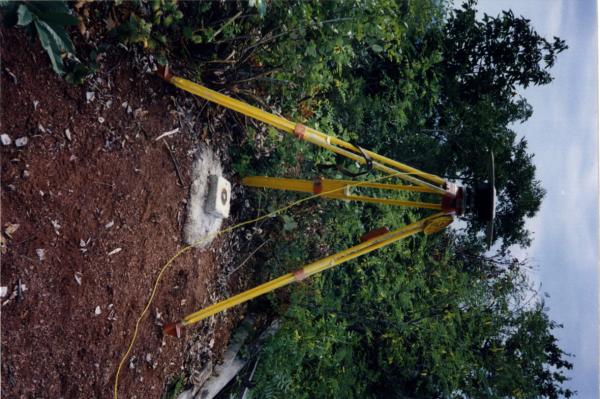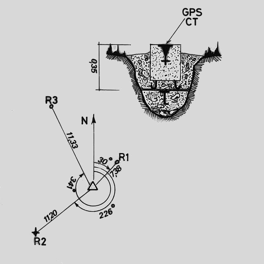 | materializzazione | Centrino del tipo "GPS A" fissato su preesistente centrino IGM del tipo di superficie cementato su blocchetto prefabbricato di calcestruzzo e sottostante centrino di fondo coassiale situati alla sommità del poggetto tra la strada tagliafuoco ed il vigneto. Riferimenti: R1 e R3 centrini metallici, R2 croce incisa su roccia. |