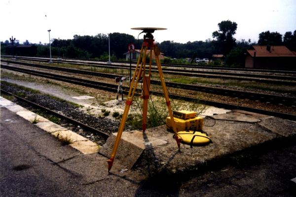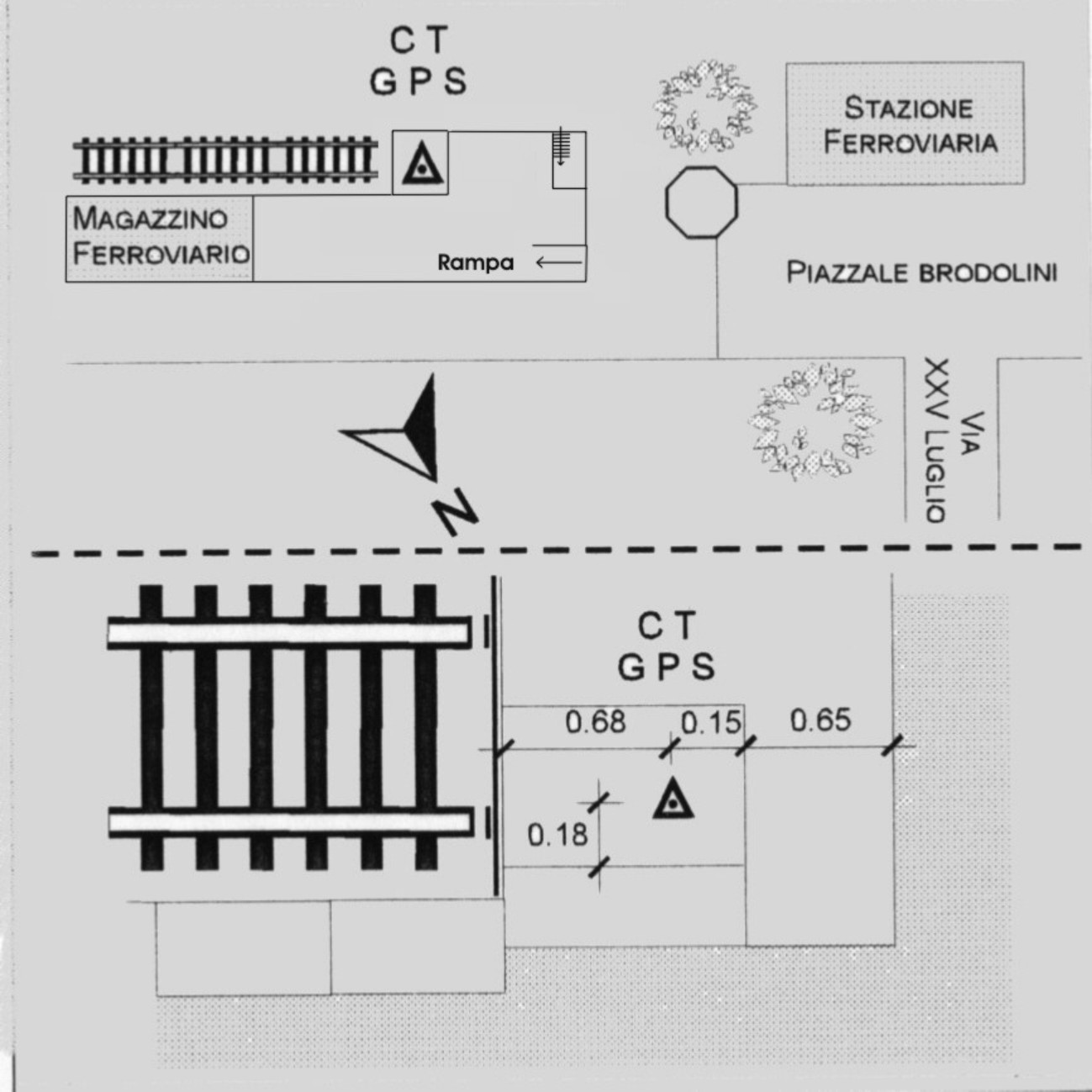 | materializzazione | Centrino in acciaio inox del tipo "GPS C" infisso nella sommità del blocco in granito che funge da punto terminale del binario secondario della stazione, nell'area adibita a magazzino ferroviario. |