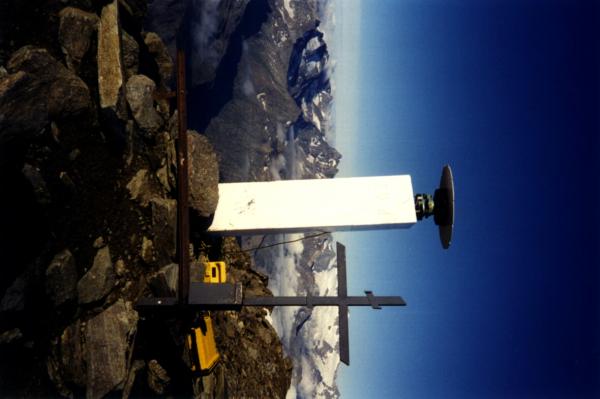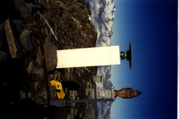 Centrino del tipo "GPS A" fissato alla sommità ed in corrispondenza dell'asse geometrico del pilastrino in ferro a sezione triangolare esistente sulla cima del monte omonimo. Riferimenti: R1, R3 (croci incise su roccia); R2 (statuetta della Madonna in campana di vetro).