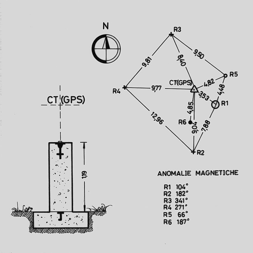 Centrino del tipo "GPS A" fissato su centrino IGM del tipo di superficie cementato alla sommità di un pilastrino in muratura, coincidente con l'asse geometrico dello stesso, e sottostante centrino di fondo coassiale.