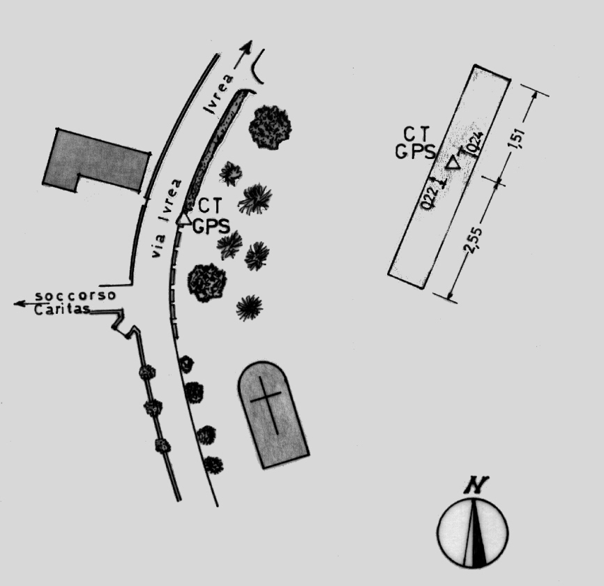 | materializzazione | Centrino del tipo "GPS C" infisso sul parapetto in cemento esistente sul lato est di Via Ivrea, nei pressi della Chiesa S.M. Trinità. |