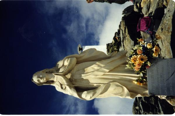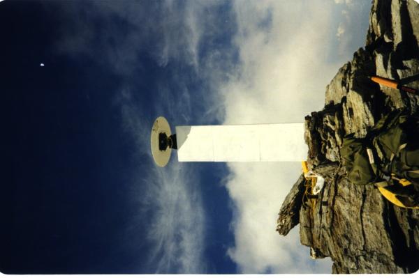 Centrino del tipo "GPS A" fissato, in coincidenza dell'asse geometrico, sul pilastrino in ferro a sezione triangolare, situato sulla parte terminale (sud-ovest) della cresta del complesso del Rutor.