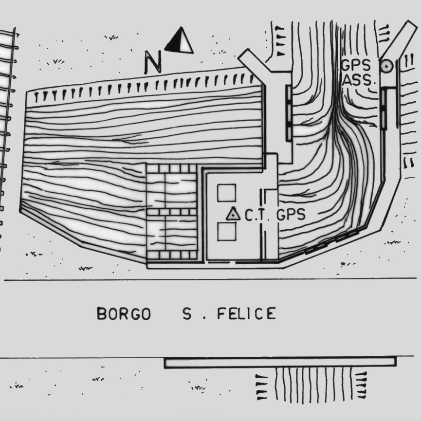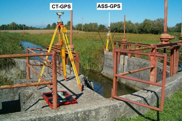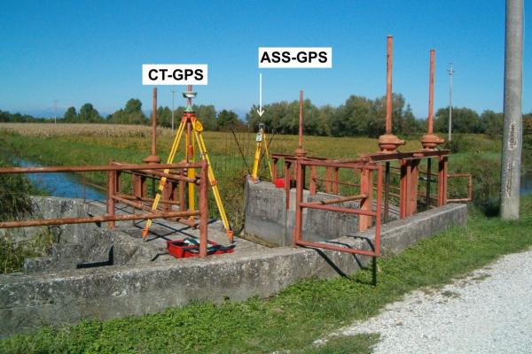 Centrino di tipo "GPS C" fissato fra due botole metalliche, nel cemento armato della chiusa a nord-est del Duomo di Aquileia e sul braccio ovest dei canali.