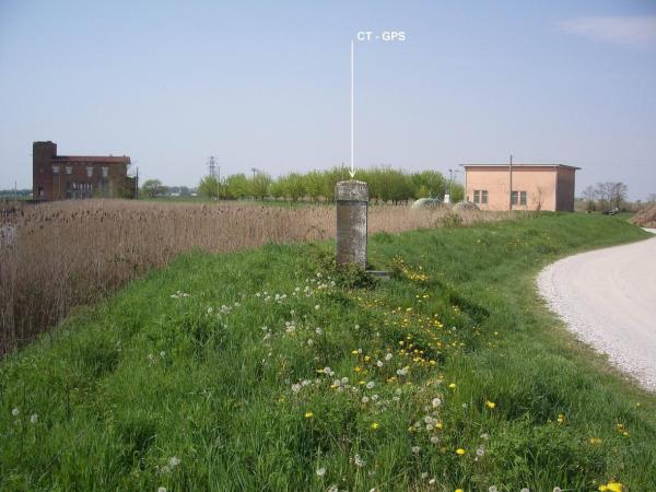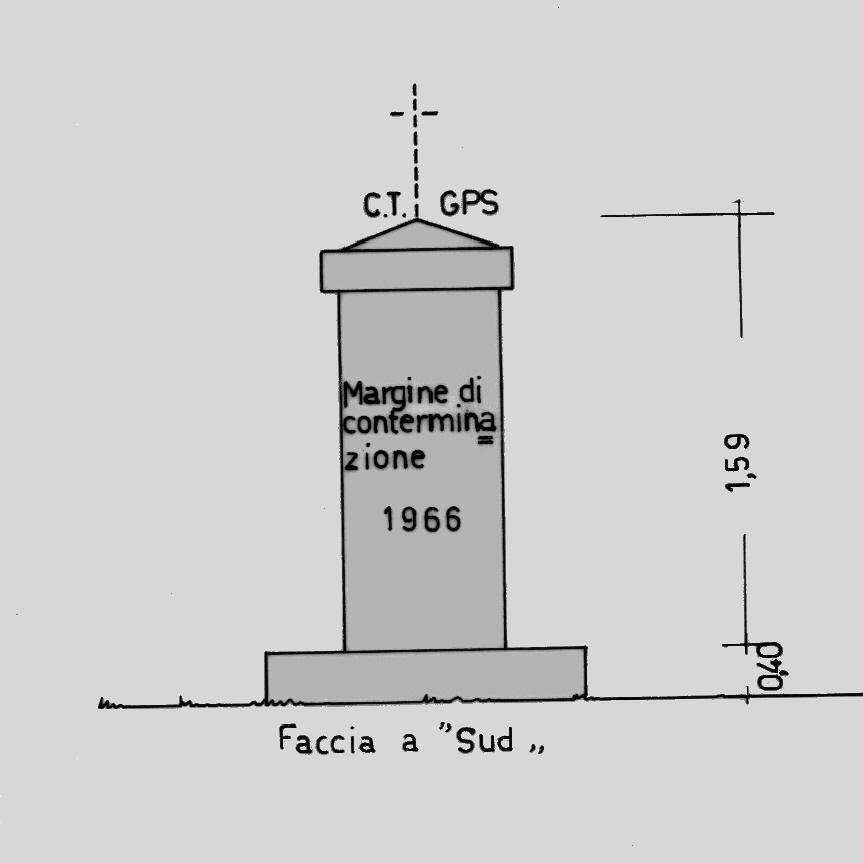 Centrino di tipo "GPSC" fissato alla sommità e nel centro del pilastro in pietra con scritta "margine di conterminazione 1966" sito a circa m. 150 dall'Idrovora Lame.