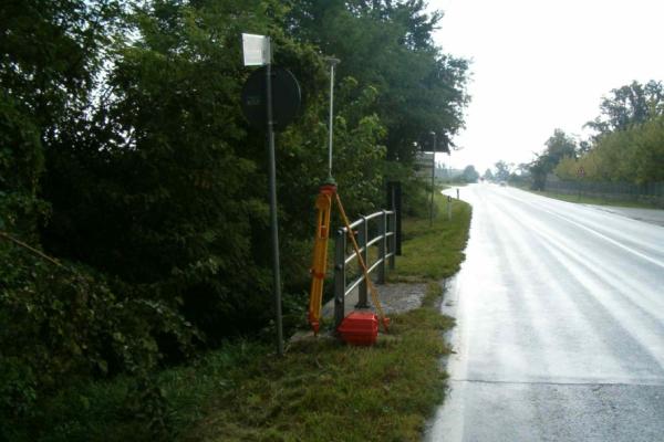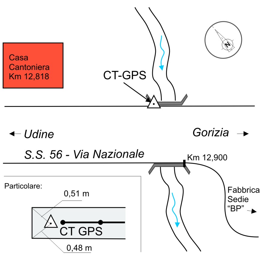 Centrino in acciaio Inox del tipo "GPS da livellazione" infisso sulla sommità del cordolo in cemento armato alla base del parapetto del ponticello esistente, a circa 57 metri dalla Casa Cantoniera, sulla S.S.56 al km 12,900.