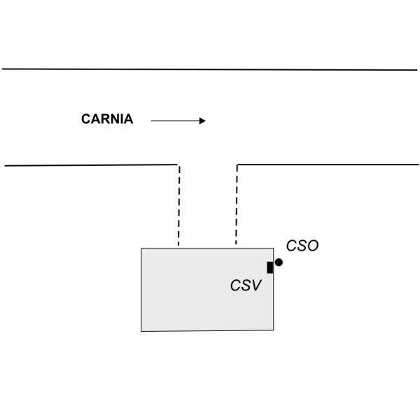 [{"simbolo_contrassegno":"P2","materializzazione":"(CSO) – Alla base della parete di sinistra, presso lo spigolo anteriore."},{"simbolo_contrassegno":"V1","materializzazione":"(CSV) – Sulla parete suddetta, in corrispondenza del cso."}]
