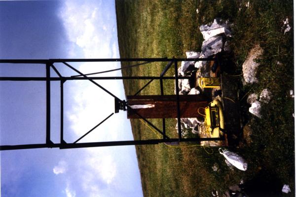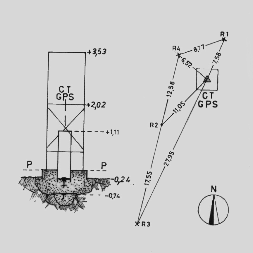 | materializzazione | Asse geometrico del pilastrino in ferro a sezione triangolare, con sottostante centrino IGM del tipo di superficie e sovrastante collimatore in traliccio metallico (privo delle alette) coassiali. Riferimenti: R1, R3, R4 (croci incise su roccia), R2 (gambo di centrino metallico). |