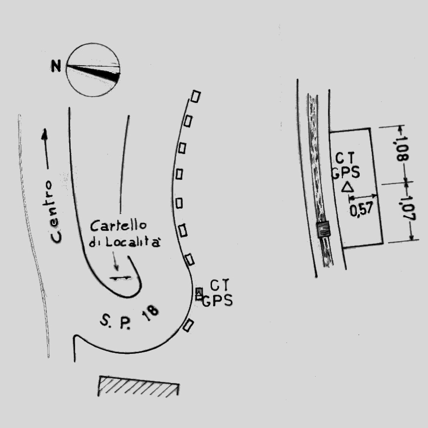 | materializzazione | Centrino di tipo "GPS C" infisso alla sommità dell'ottavo plinto, a partire dal più basso in quota (o secondo, partendo invece dal più alto in quota), esistente, esternamente alla sede stradale, in corrispondenza del tornante della strada provinciale 18 a sud-ovest della chiesa parrocchiale. |
