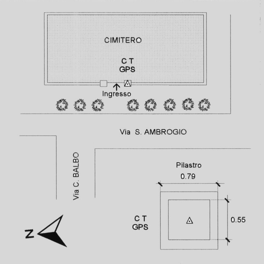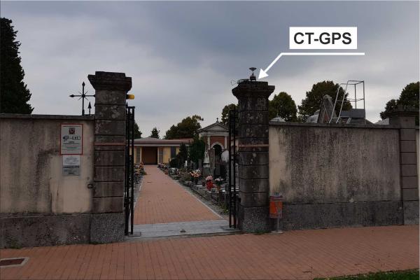Centrino di tipo "GPS C" fissato alla sommità ed in corrispondenza dell'asse geometrico del pilastro di destra dell'ingresso principale del cimitero in Via S.Ambrogio.