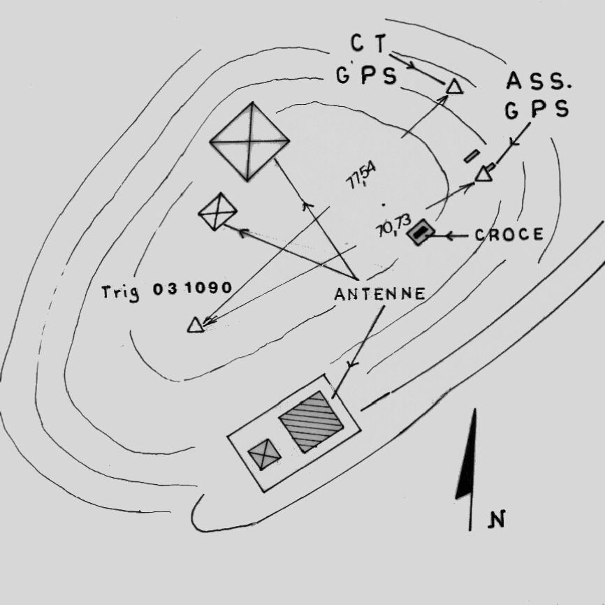 Centrino di tipo "GPS A" fissato sul centrino di superficie cementato in un blocchetto di calcestruzzo, cementato sul terreno in prossimità del FC1 (GPS) Ms 1990 G/1 ora scomparso.