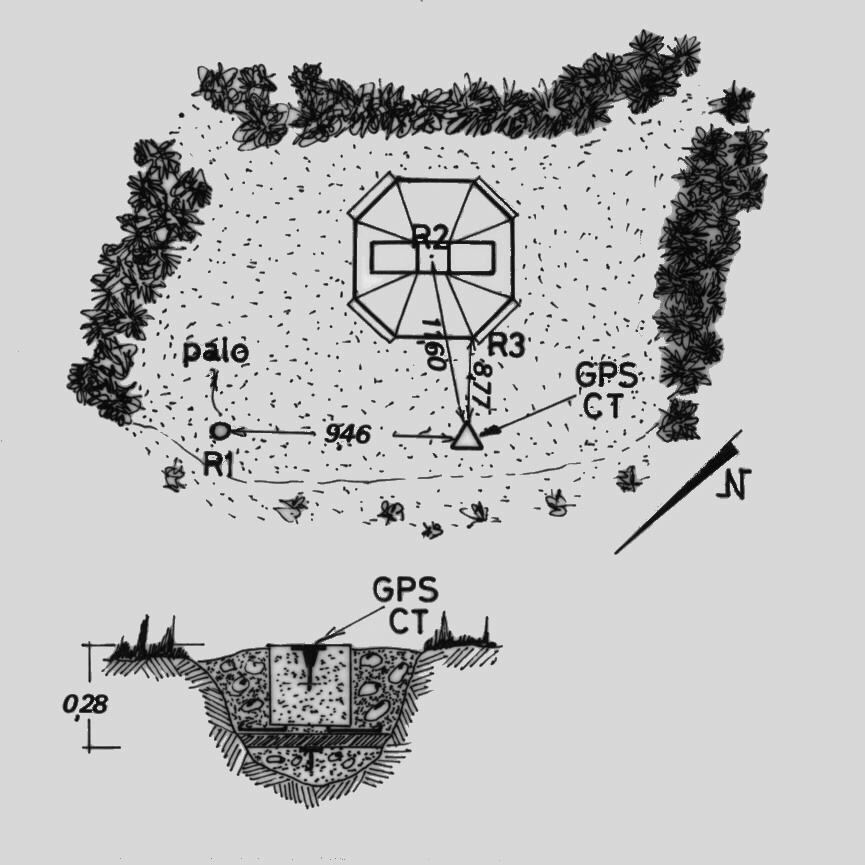 | materializzazione | Centrino di tipo "GPS A" fissato sul preesistente centrino IGM del tipo di superficie cementato in un blocchetto prefabbricato di calcestruzzo, e sottostante centrino di fondo coassiale, esistenti nel piazzale a nord della croce. Riferimenti: R1 (palo), R2 (asse croce), R3 (spigolo base croce). |