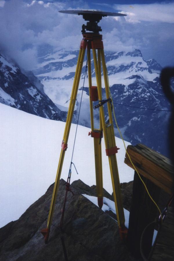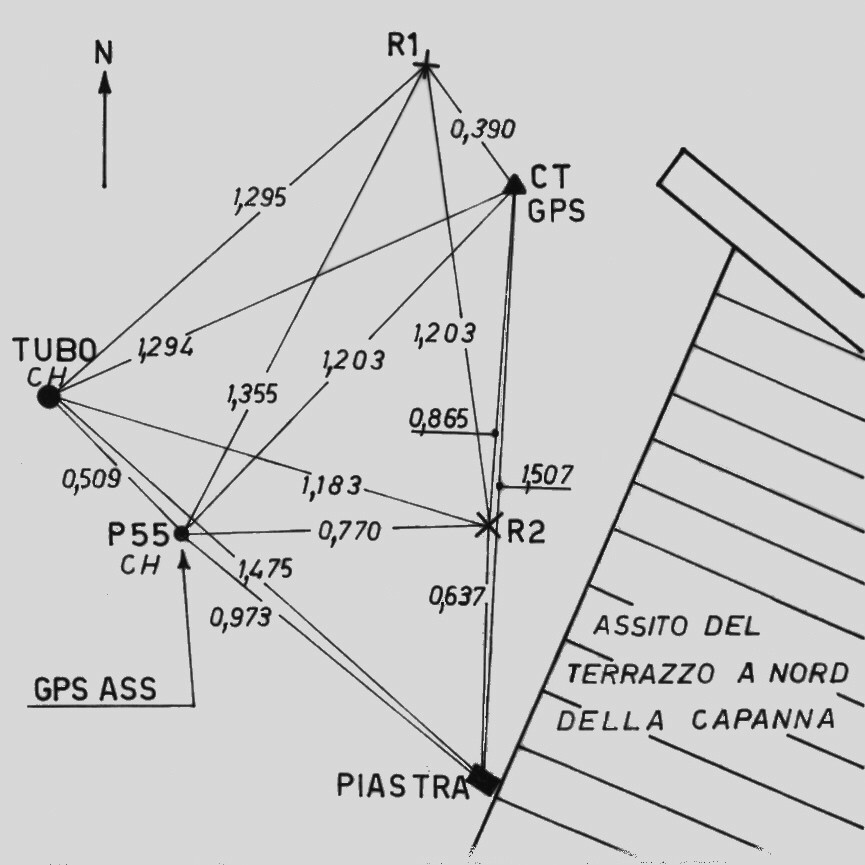 Centrino di tipo "GPS C" cementato su roccia alla sommità di Punta Gnifetti nel gruppo del Monte Rosa, in prossimità del terrazzo sul lato nord della Capanna Regina Margherita. Riferimenti: R1, R2 (croci incise su roccia), piastra di confine, tubo metallico alto 71 cm (vertice svizzero).