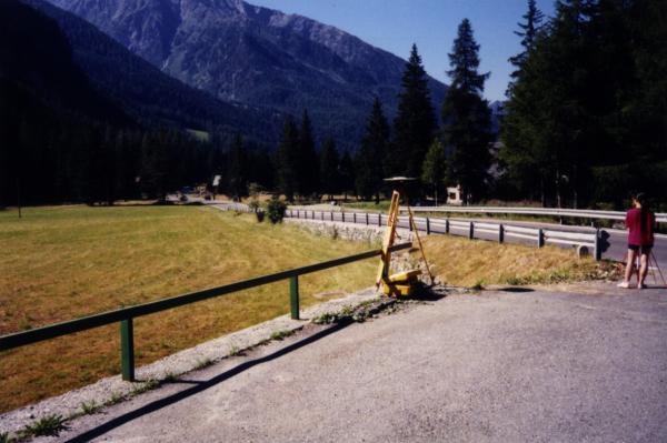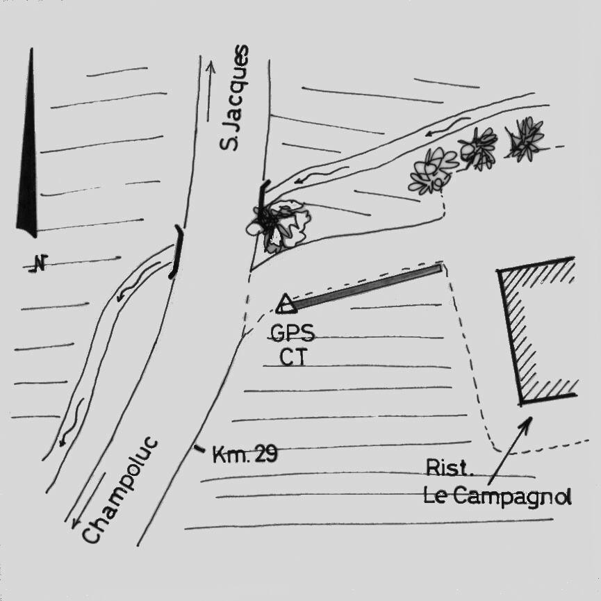 | materializzazione | Centrino in acciaio inox del tipo "GPS C" infisso nel cordolo in calcestruzzo del muro di sostegno della strada di accesso al ristorante. |