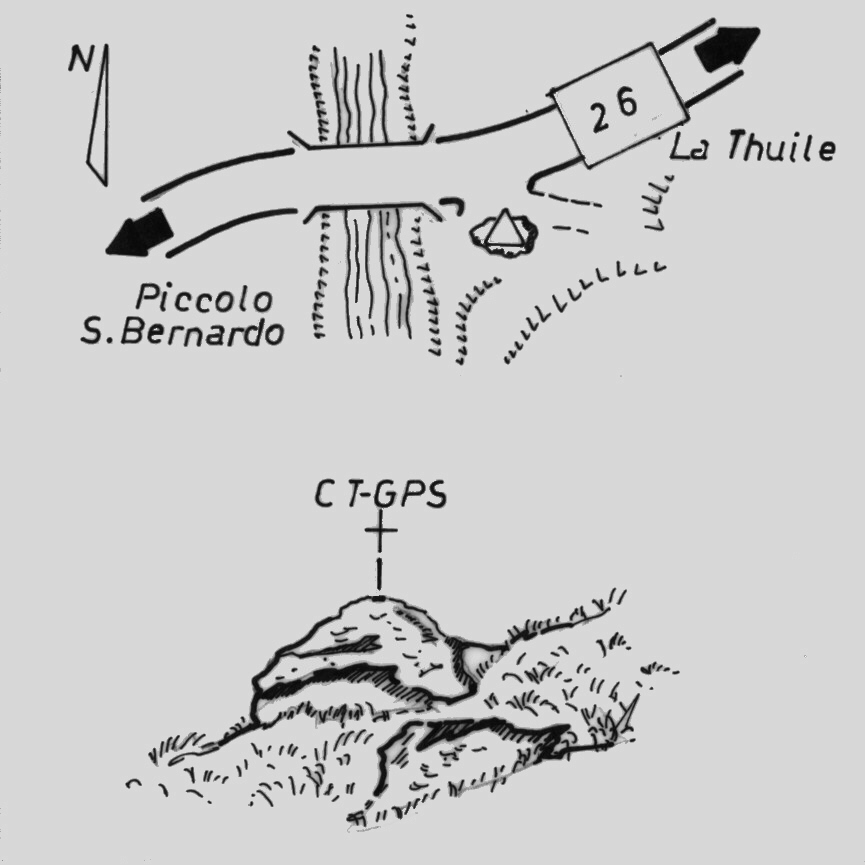 | materializzazione | Centrino di tipo "GPS C" fissato su roccia situata presso il margine sud della S.S. 26, a pochi metri da un ponticello. |