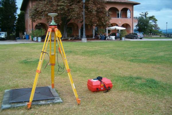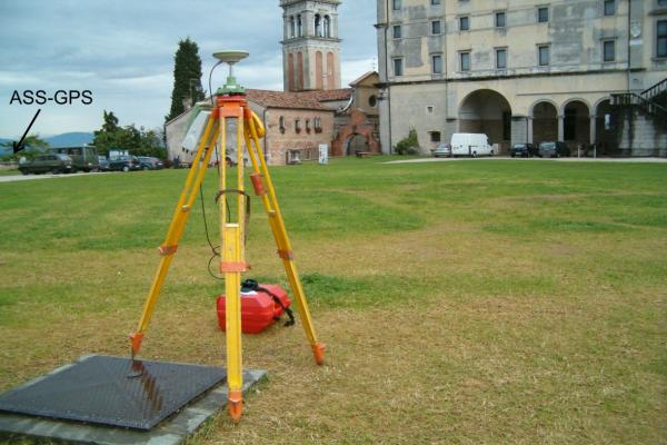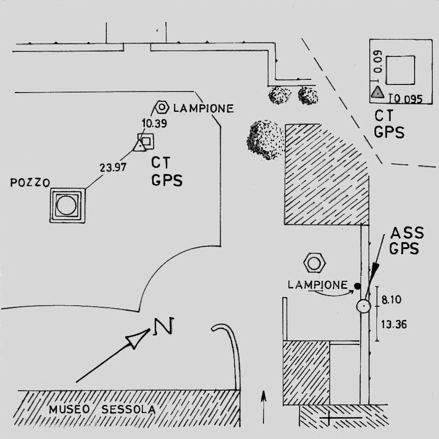 | materializzazione | Centrino di tipo "GPS C" infisso sul cordolo in pietra del tombino di ispezione al sottostante serbatoio dell'acquedotto (non visibile), nel giardino del castello di Udine. |