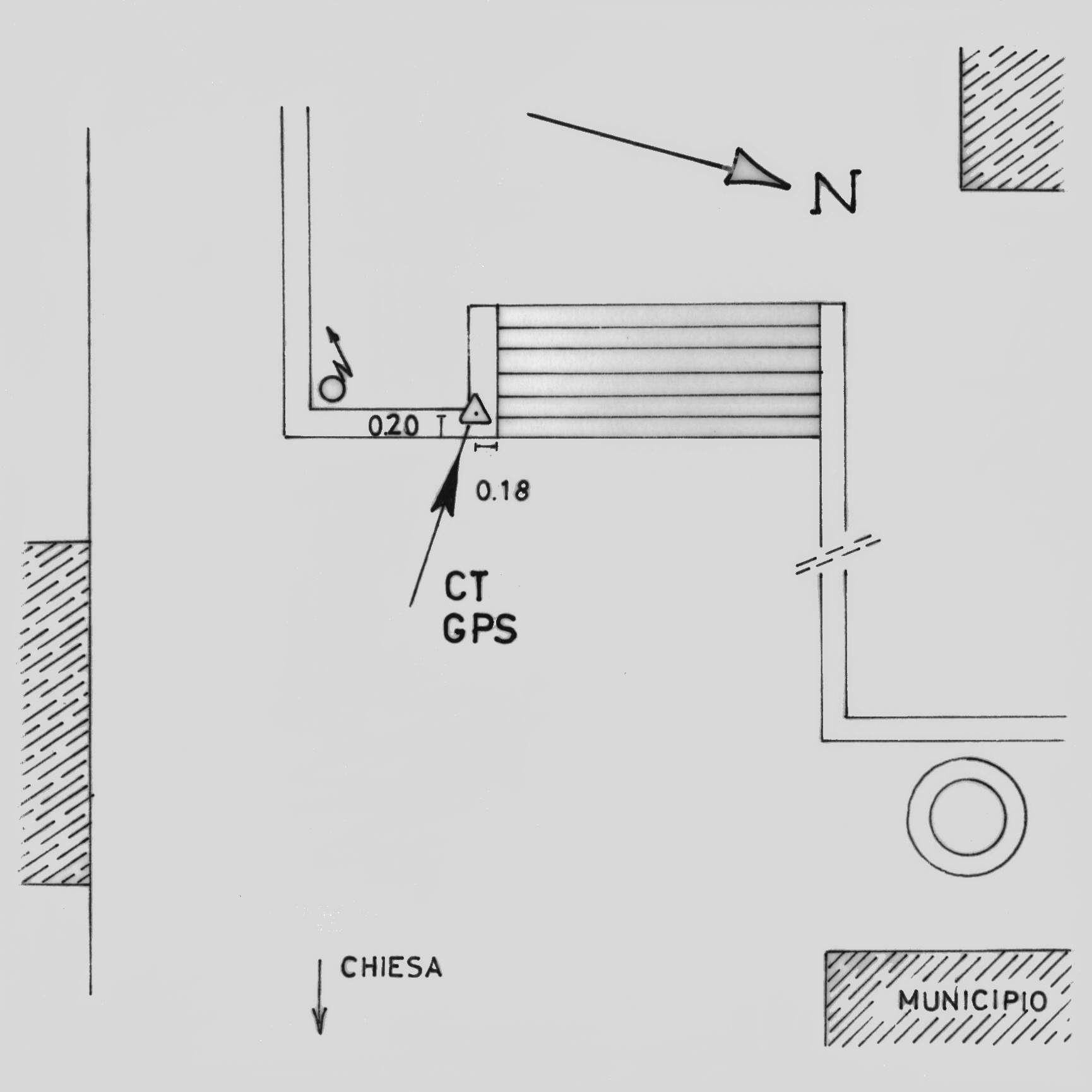 | materializzazione | Centrino di tipo "GPS C" infisso in prossimità dello spigolo del muro in cemento armato, che delimita il terrapieno e la scalinata della piazza, di fronte alla chiesa |
