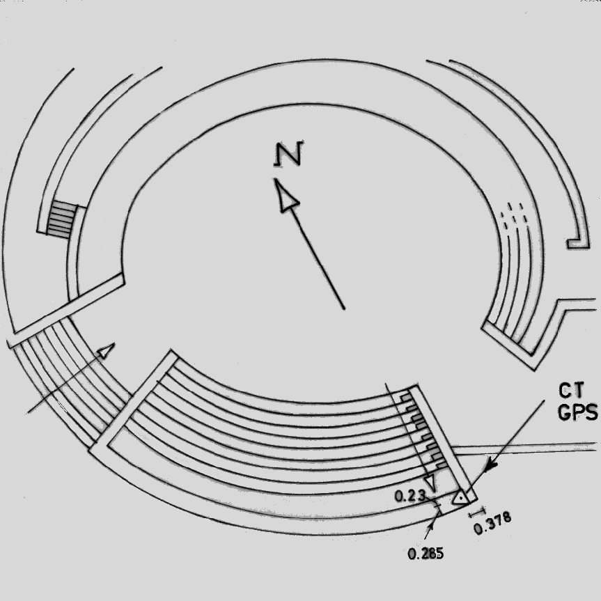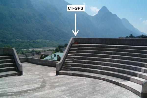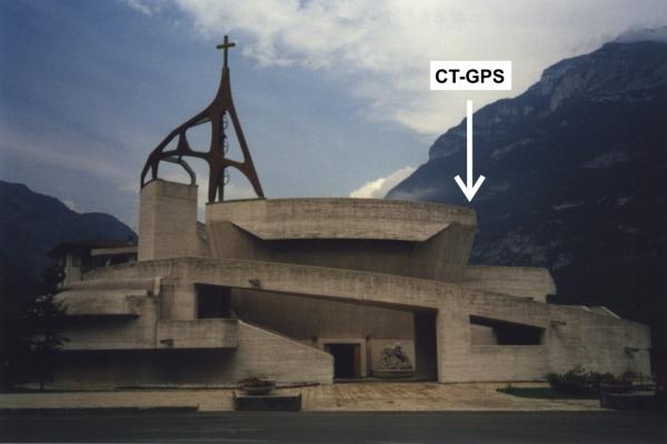 Centrino di tipo "GPS C" infisso sullo spigolo sud del muro in cemento armato dell'anfiteatro ellittico sopra alla chiesa parrocchiale.