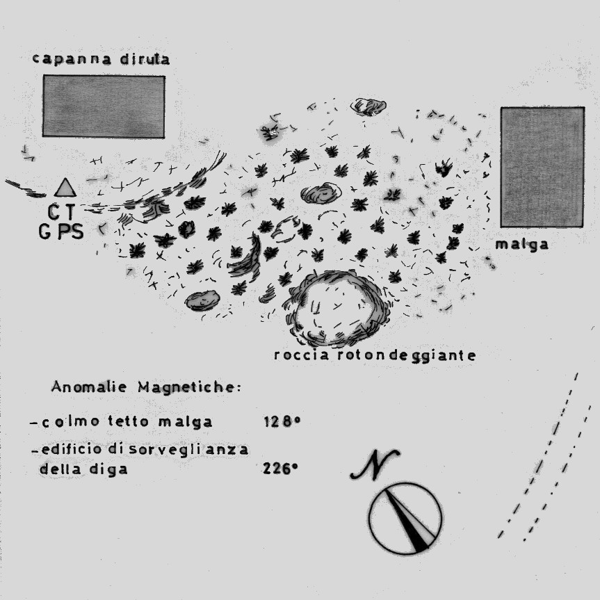| materializzazione | Centrino di tipo "GPS C" infisso su roccia, a sud ovest della sommità del banco roccioso situato a nord-ovest della malga e nei pressi della capanna diruta. |
