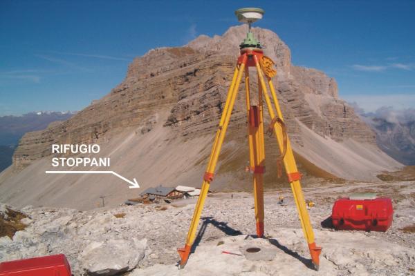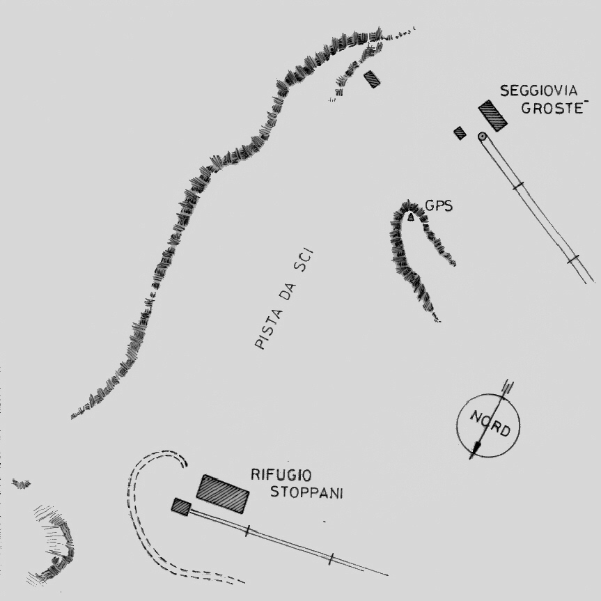 Centrino metallico di superfice cementato sulla punta più alta del banco di roccia che sorge fra le due piste da sci.