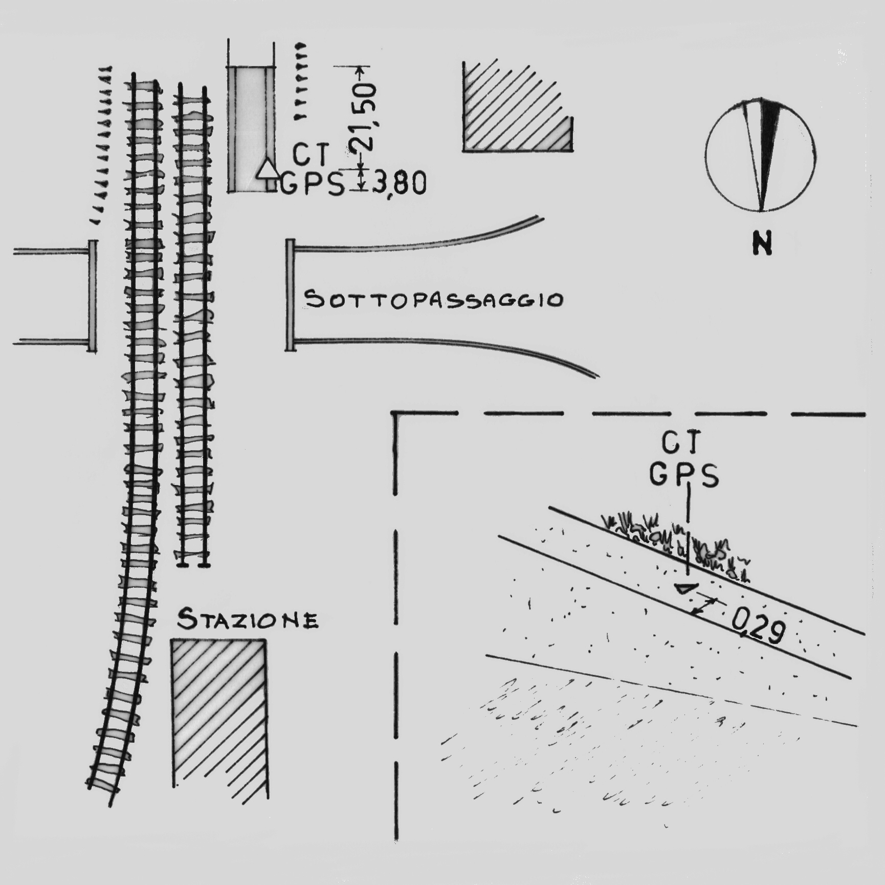 Centrino di tipo "GPS C" infisso a 3,80 metri dall'estremo nord, alla sommità della spalla ovest del deposito di ghiaia situato lungo il binario morto della stazione.