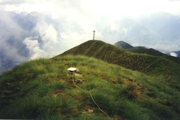 Centrino di superficie e sottostante coassiale centrino di fondo cementati in blocchi indipendenti sulla cresta del monte, circa 100 metri a sud di una croce a traliccio di ferro. Riferimenti: R1 (croce incisa su roccia), R2 (gambo di centrino), R3 (centrino metallico).