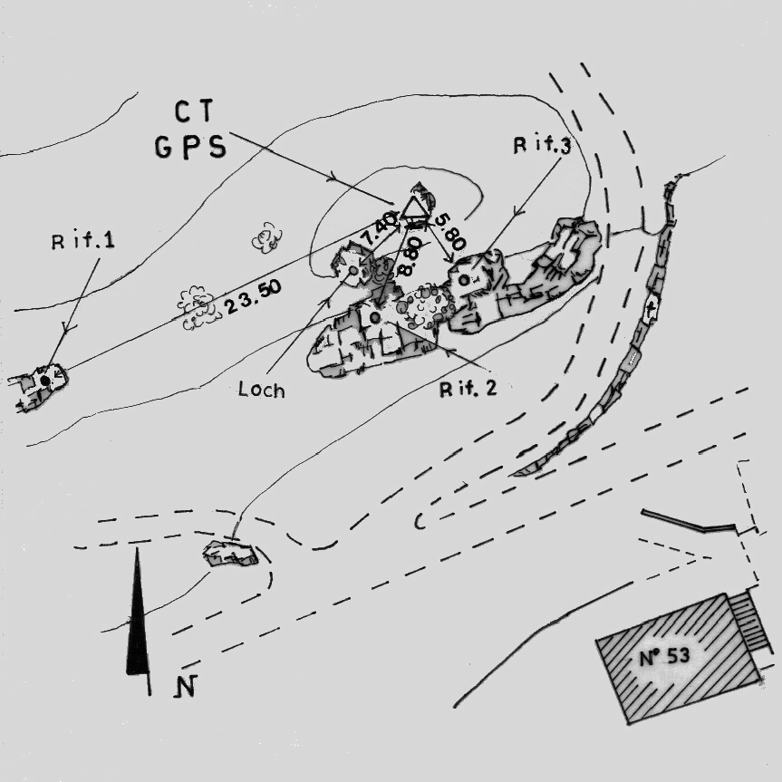 Materializzazione Svizzera costituita da un bullone svitabile su roccia di poco sotto il livello del terreno (5 cm). Riferimenti: Ex z1 = Rif.1 (bullone di bronzo su roccia affiorante); Ex z2 = Rif.2 ( bullone di bronzo su roccia affiorante); Ex z3 = Rif.3 (idem Rif.2); Loch = Rif.4 (foro su roccia affiorante).