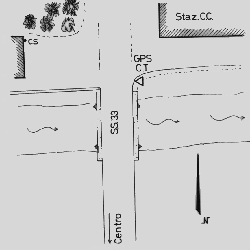 | materializzazione | Centrino in acciaio inox del tipo "GPS C" infisso nel marciapiede alla testata nord-est del ponte sul Torrente Ovesca, di fronte alla Stazione dei Carabinieri. |