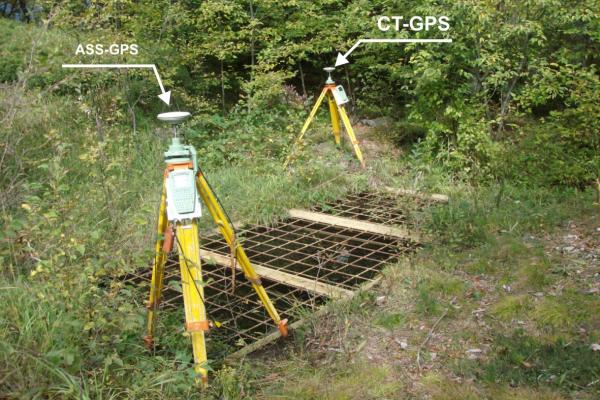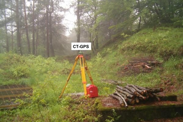 Centrino di tipo "GPS C" infisso sul basamento in cemento per la raccolta delle acque presso una vasca, sulla cima del M. Corona.