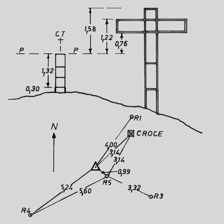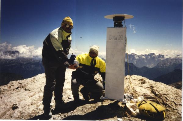 | materializzazione | Asse geometrico del pilastrino in ferro a sezione triangolare e sottostante centrino di zinco, cementati alla sommità della Punta Penia nel gruppo del M. Marmolada. |