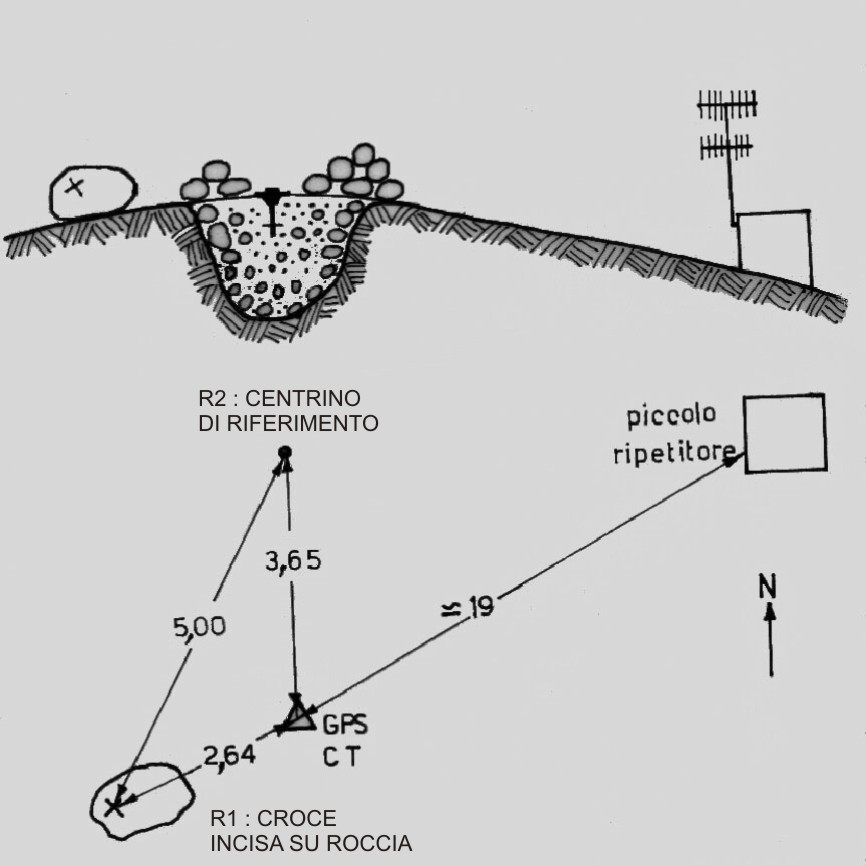 | materializzazione | Centrino di tipo "GPS A" fissato su un centrino di superficie, cementato alla sommità del monte ed evidenziato da un cumulo di sassi. Riferimenti : antenna di un piccolo ripetitore posta a circa 19 m direzione sud-ovest; R1 : croce incisa su un grosso masso posta a 2,64 m direzione nord-est; R2 : centrino di riferimento IGM a 3,65 m in direzione nord. |