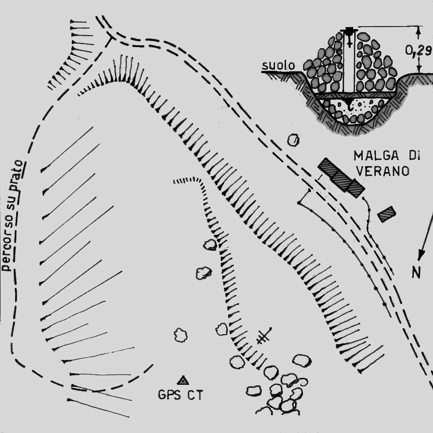 Centrino di tipo "GPS A" fissato su preesistente centrino IGM del tipo di superficie cementato alla sommità di un cumulo di sassi murati, sul pendio sud del Monte di Verano a circa 200 metri dalla cima piatta di esso e a circa 250 metri a nord della Malga di Verano (indicata come Malga del Toro sulla cartografia IGM scala 1:50.000).