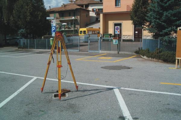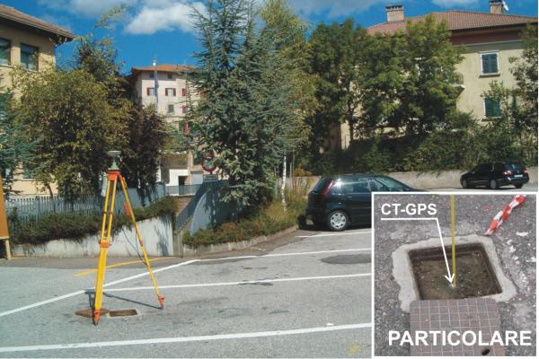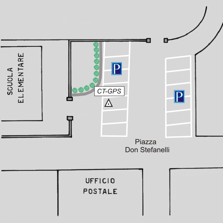 Centrino di tipo "GPS C" fissato all'interno di un chiusino quadrato in ghisa posto in prossimità del centro della piazza.