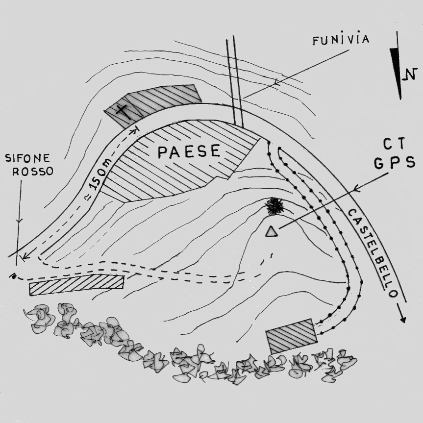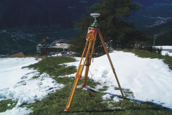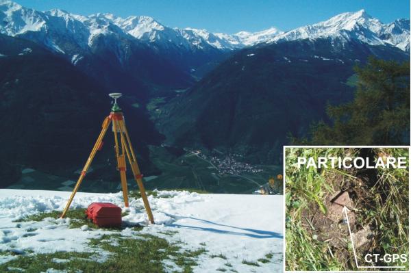 Centrino in ghisa del Catasto di Bolzano posto in asse vecchio centrino di fondo. Il CT-GPS è sul prato sopra l'arrivo della funivia in prossimità di un larice.