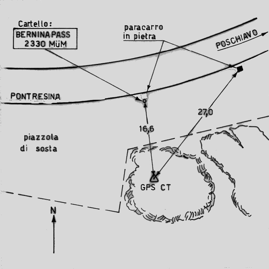 | materializzazione | Centrino metallico cementato su roccia affiorante al bordo sud della strada sul Passo del Bernina, in corrispondenza del punto più alto di questa e 16,6 metri a sud del cartello "Berninapass 2330 Mum". |