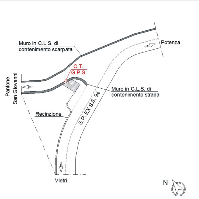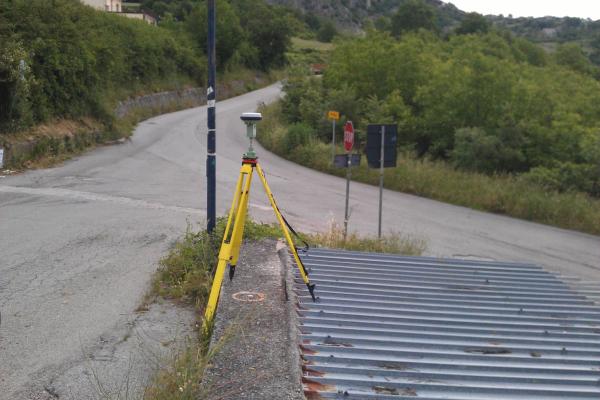 | materializzazione | Centrino metallico orizzontale di tipo chiodo con rondella ARPAB della Regione Basilicata infisso sulla testa del muro in C.L.S. di contenimento strada. |