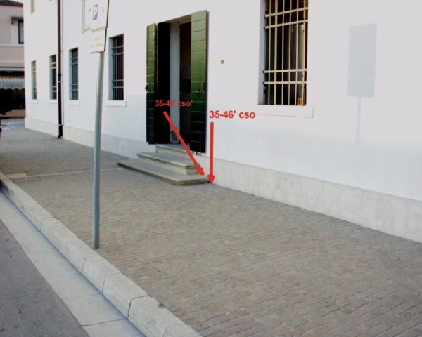 | Contrassegni | [{"simbolo_contrassegno":"B2","materializzazione":"(CSO) – Chiodo anonimo del CNR posto sul marciapiede adiacente al primo gradino,a destra entrando."},{"simbolo_contrassegno":"B3","materializzazione":"(CSO') – Circolo inciso sul primo gradino a destra in vicinanza al muro."},{"simbolo_contrassegno":"V5","materializzazione":"(CSV) – Targa infissa a destra della porta d'ingresso al municipio."}] |