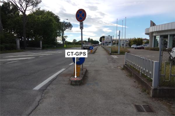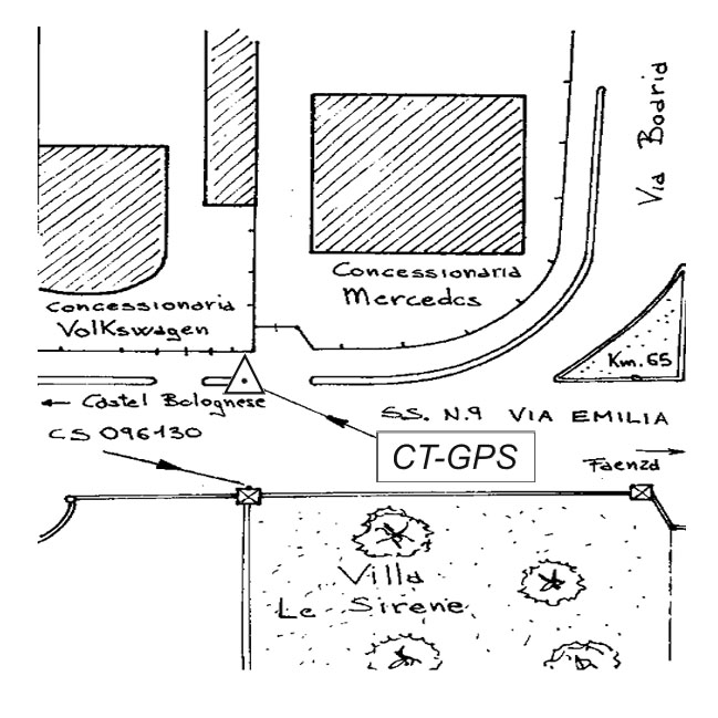 | Materializzazione | Centrino in acciao inox del tipo GPS C anonimo, infisso nel cordolo in cemento che delimita la piccola isola spartitraffico posta lungo la S.S. 9 – Via Emilia, all'altezza del km 65,430 di fronte alla concessionaria Wolkswagen situata alla periferia di Faenza. |