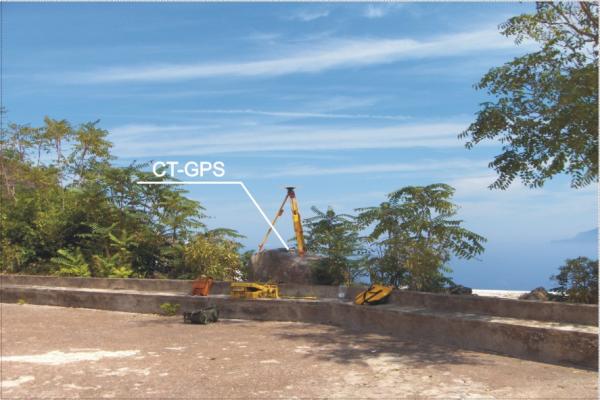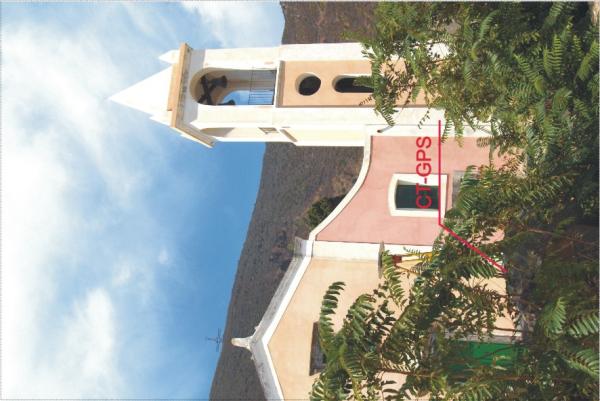 Centrino GPS di tipo "C" infisso sulla sommità di una roccia affiorante sporgente a filo esterno del muro di contorno del piazzale, di fronte alla chiesa di Santo Stefano.