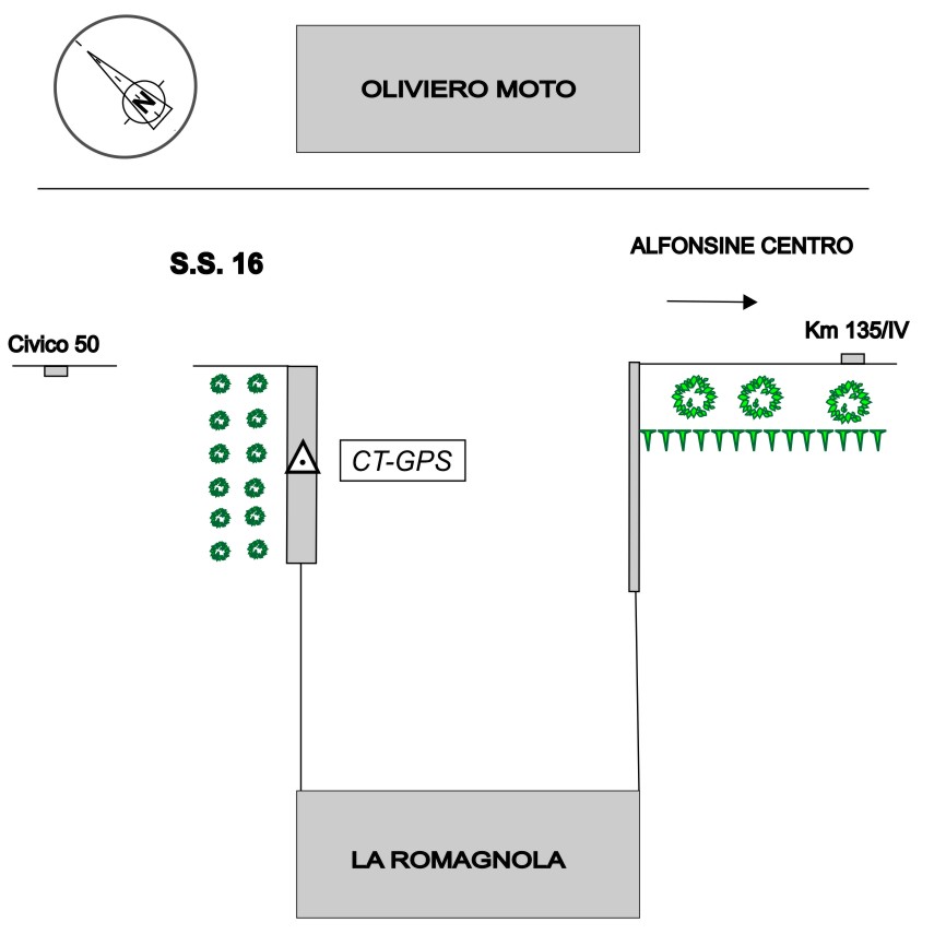 | Materializzazione | Centrino in acciaio inox del tipo"GPS C", posto sul muretto d'accesso all'azienda "La Romagnola" e di fronte all'officina meccanica. |