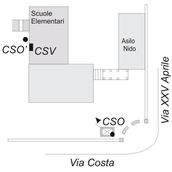 | Contrassegni | [{"simbolo_contrassegno":"B4","materializzazione":"(CSO) – Centrino Universale infisso sulla sommit\u00e0 della piattaforma in c.a. di base alla cabinetta elettrica posta all'ingresso da Via Costa all'Asilo Nido annesso al complesso della Scuola Elemntare."},{"simbolo_contrassegno":"B1","materializzazione":"(CSO') – Bullone IGM infisso sulla facciata volta verso la statale dell'edificio principale della Scuola Elementare, a destra della scalinata d'accesso, in corrispondenza della seconda finestra."},{"simbolo_contrassegno":"V1","materializzazione":"(CSV) – Mensola IGM infissa sulla stessa facciata, in corrispondenza del CSO."}] |