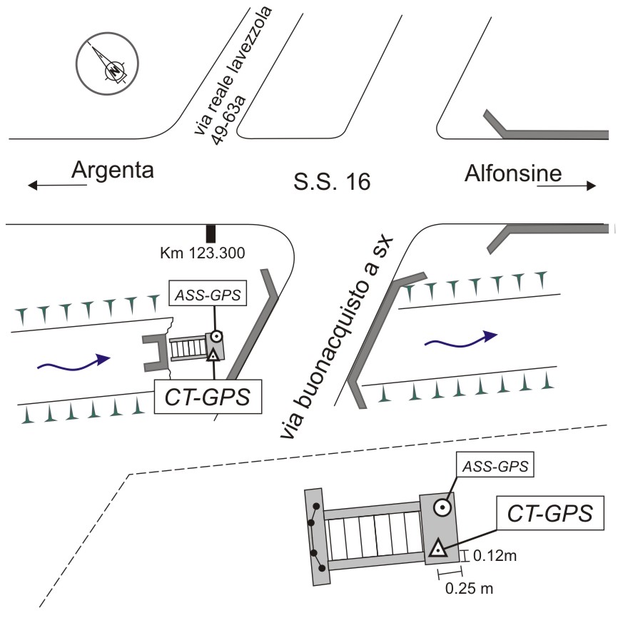 | Materializzazione | Centrino in acciaio inox del tipo "GPS C" infisso sul primo gradino delle scale d'accesso di una piccola chiusa in cemento armato. |
