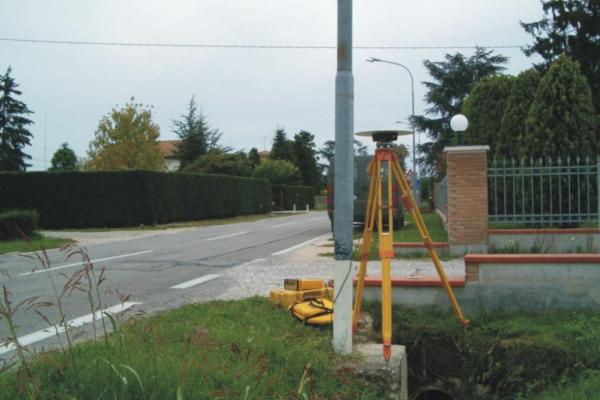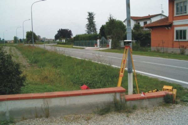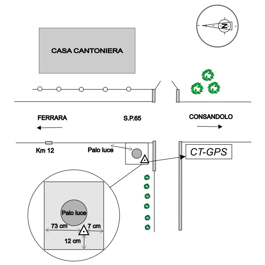| materializzazione | Centrino in acciaio inox del tipo GPS da livellazione posto alla base del palo di illuminazione sul lato sinistro della strada in direzione Ferrara, di fronte alla casa cantoniera. |