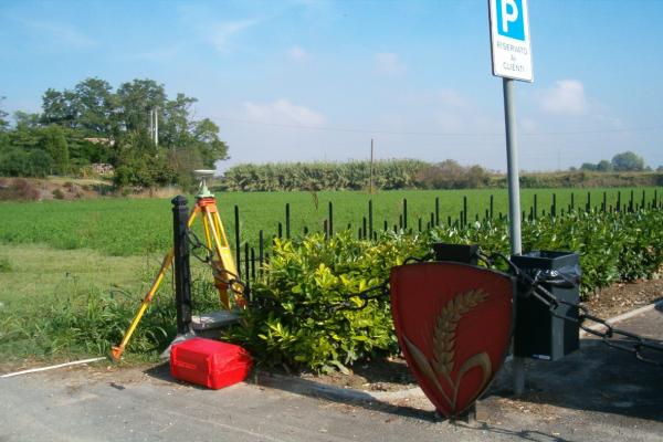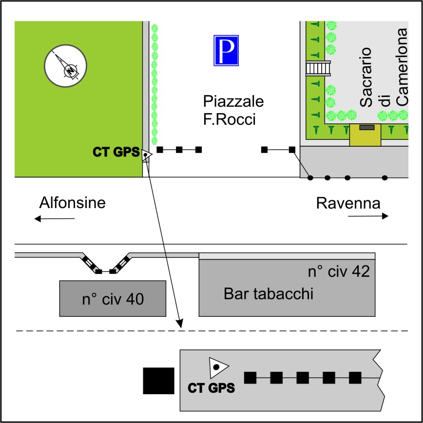 | Materializzazione | Centrino in acciaio inox del tipo "GPS C" infisso sul muro in cemento limitante il parcheggio del sacrario. Spigolo sx guardando il parcheggio. |
