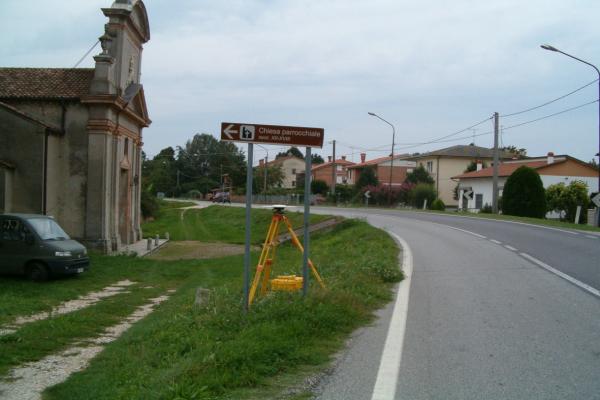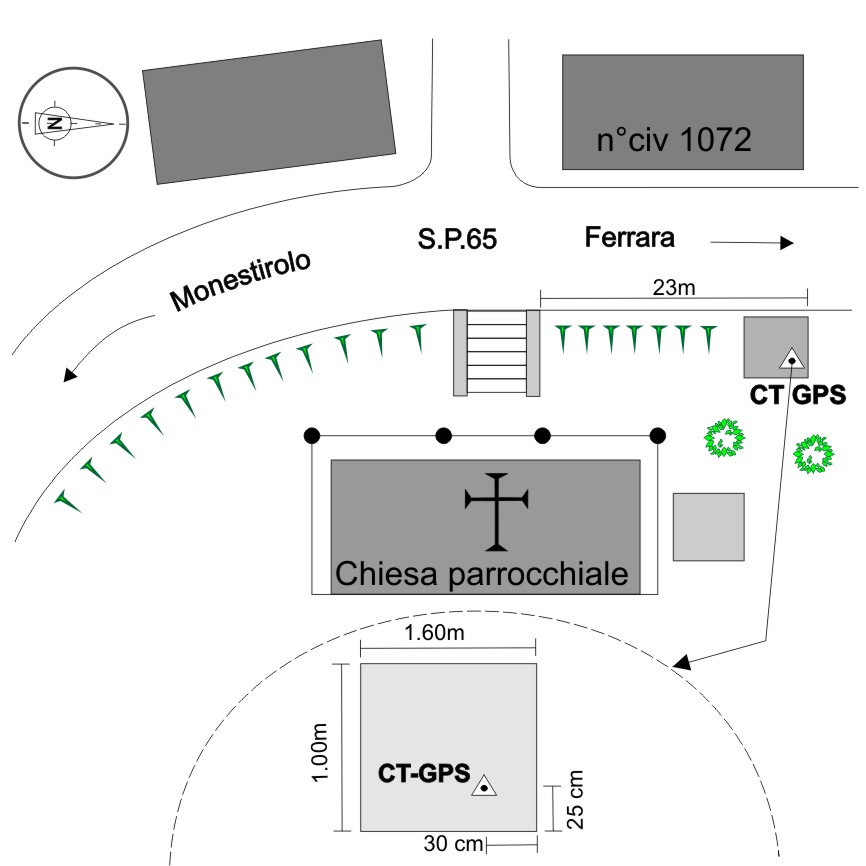 Centrino in acciaio inox del tipo"GPS C" infisso su una base in cemento e mattoni posta allla sinistra della facciata della chiesa.