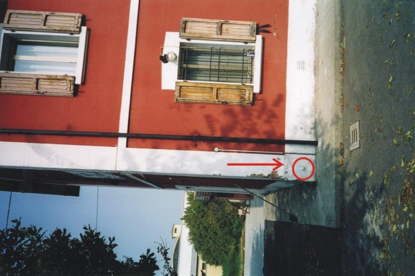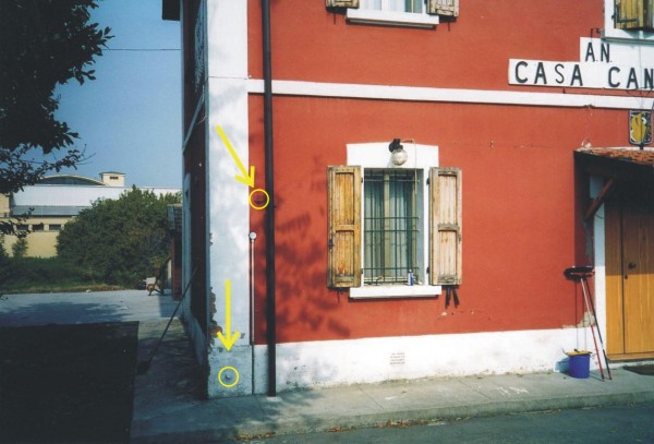 | Contrassegni | [{"simbolo_contrassegno":"B1","materializzazione":"(CSO) – Bullone infisso presso lo spigolo sinistro della facciata."},{"simbolo_contrassegno":"V1","materializzazione":"(CSV) – Mensola fissata in corrispondenza del CSO."}] |