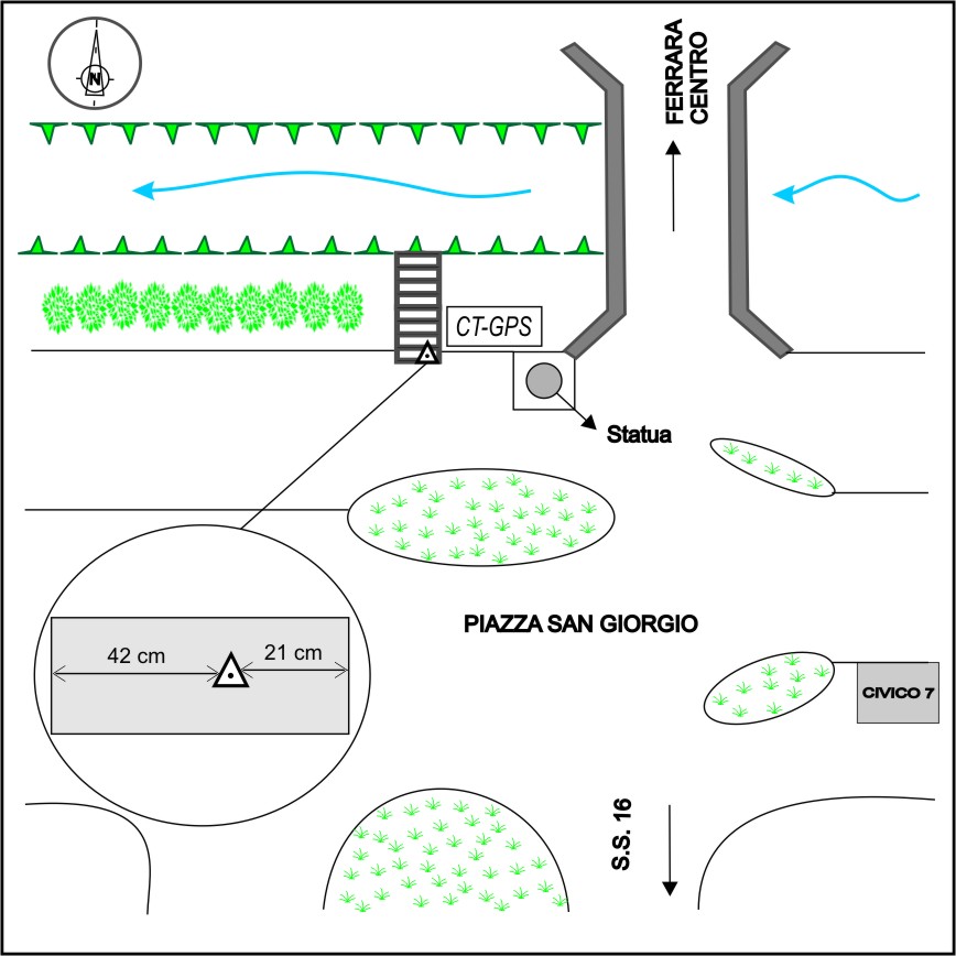 | materializzazione | Centrino in acciaio inox del tipo "GPS C" posto sul primo scalino della scala che permette l'accesso al fiume, prima del ponte, sulla sinistra in direzione del centro di Ferrara. |