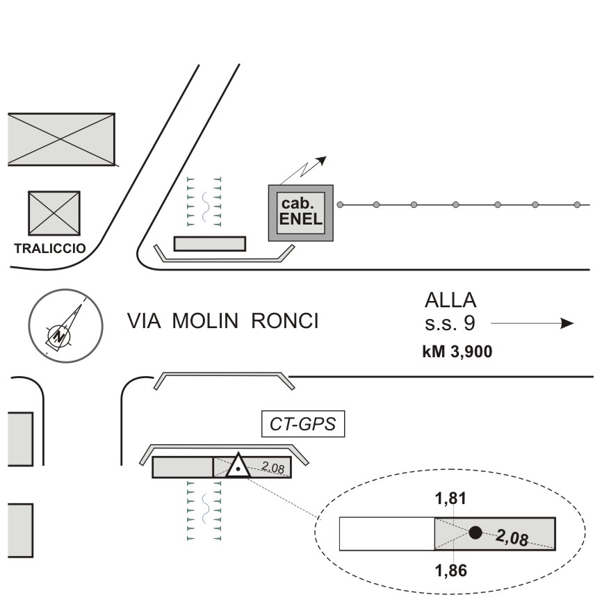 | Materializzazione | Centrino in acciaio inox del tipo "GPS C" infisso sulla spalletta del cordolo in cemento del ponticello. |