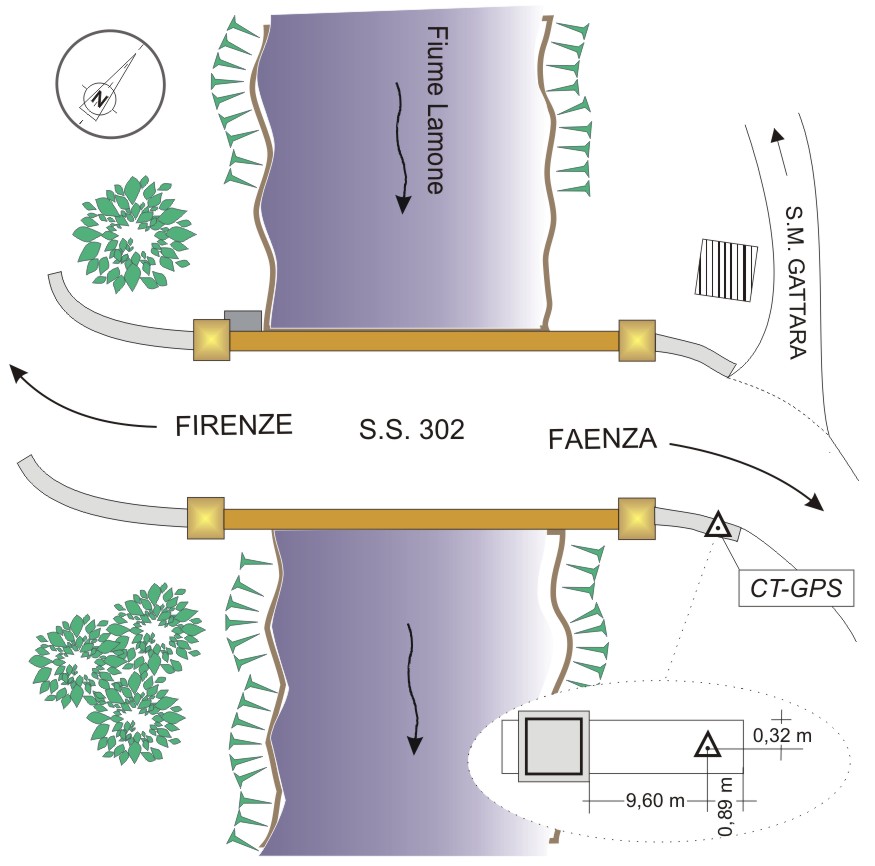 | Materializzazione | Centrino in acciaio inox del tipo "GPS C" infisso sul muro di sostegno in cemento armato del ponte. |